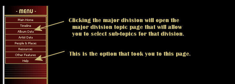 The top menu's content does not change as you move through the web site. This menu is there to give you a quick way to jump from one major division to another and to allow visitors who's web browser does not support Java to be able to navigate the site. (See illustration below)
