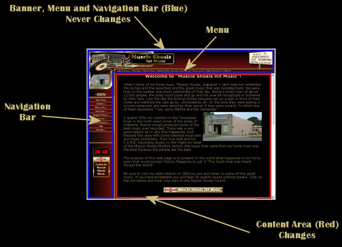 Let's begin with a look at the construction of the page. There are (2) major area on the page. (1-Blue) This is the Banner, Menu and Navigation Bar area. (2-Red) This the Content Area which changes to display your selection that you made from the Menu or the Nav Bar. The advantage of a frame built page is that your Menu and Nav Bar never changes or moves but stays in the same place with the same content. (See illustration below)