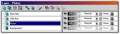 - Make sure your layer palette looks like the image below. The "Plates" layer must be below the "Title Bar" and "Item Bar" layers. The plates that we are going to build next must be under the bars and in order for this to happen the "Plates Layer" must be under the bars. The stack order the the layer palette determines the stack order in the image. Neat, right?