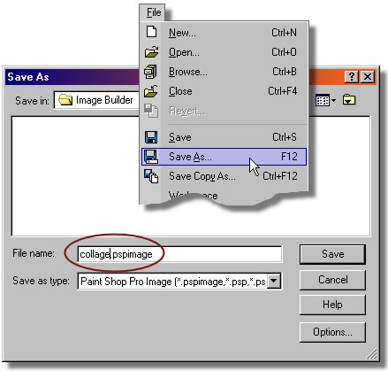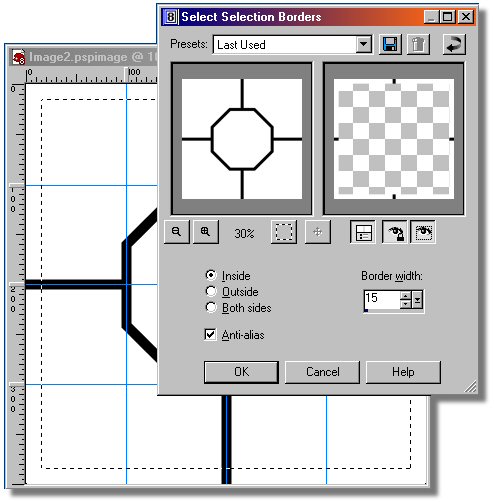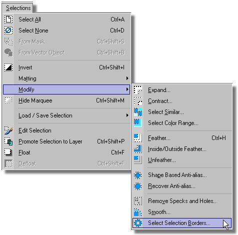 - Now select the "Selection" icon and then type Ctrl+a key to select the complete image. You should see a selection mar-key around the image (aka. "dancing ants"). Selection Icon HINT: To select the complete image type Ctrl+[a] key - Select the Selection Menu/Modify/Select Selection Borders. This command will allow us to build a selection on the edge of our image in the shape of a frame or border. In this case we will make it 15 pixels to the inside. - Make the settings in the "Select Selection Borders" dialog as shown in the image below. If you can not see the selection on your image as in the illustration below then depress the two icon that have eyeballs on them. Select OK. - It is time to save our image file. Select the File Menu/Save As. Browse to the folder where you want to place your image file and name it and with the LMB click on the Save button. I used "collage" but you can use any name you prefer. Also note in the image below that you could have pressed the F12 key to open the "Save As" dialog box. - Now we want to save the selection of our frame to an alpha channel for use later. Alpha channels are a power tool in PSP8 which can make you a PSP Pro. Select the Selection Menu/Load/Save Selections/Save Selection To Alpha Channel. In the "Save Selection To Alpha" dialog take the defaults and LMB click on the Save button. - Now we want to fill our frame with black color. Make sure black is still selected as your Foreground in your Material palette. With the LMB click on the "Flood Fill" icon in the Tools toolbar (see left column). Now with the LMB click in the selected frame and it will be filled with black. Flood Fill Icon Hint: To delete a selection type Ctrl+[d] key