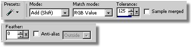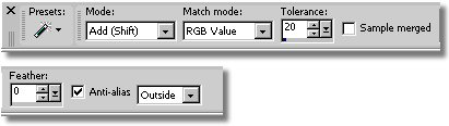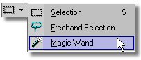 - With the LMB click on the Drop-Down arrow on the Selection icon on the Tools toolbar and release (See left-Column above at Step 4). Now LMB click on Magic Wand icon on the drop-down menu. This action will not only select the Magic Wand command but will also place the Magic Wand icon on the Tools toolbar as the visible default. - Now let's hide our Guides by selecting the View Menu/Guides. This is a toggle icon so the Guides are turned off since they were on. To turn them on again you would select the View Menu/Guides. - On the Tool Options palette make the setting as shown in the image below. - With the Magic Wand select LMB click in each of the (5) white areas to select them. - Now select the Selection Menu/Invert. This inverts the selection and makes the black color selected and not the white. - Now we want to save the selection of our seam/frame to an alpha channel for use later. Select the Selection Menu/Load/Save Selections/Save Selection To Alpha Channel. In the "Save Selection To Alpha" dialog take the defaults, notice that the name is now "Selection #2". With the LMB click on the Save button. We now have (2) Alpha Channels saved with our image file. We will use them later for flood filling the seams (Selection #2) and the frame (Selection #1). - Type Ctrl-d to remove our selection.