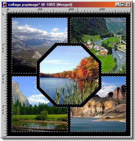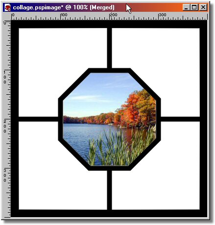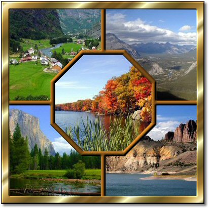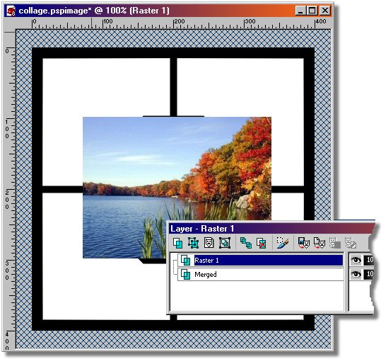 - Open your first image that you want to use as a center picture piece. I will do the center piece with you and you can do the other (4) pieces on your own. The image I opened is below (pc1.jpg). - We want to size our images so they will fit our opening in the width or the height. If you will observe our openings you will notice that they are squares measuring 200 x 200 pixels. The pictures that I have decided to use are all in the landscape orientation. So I simply resized them so the height will equal the height of our squares or 200 pixels. If you would like to use my resized images then download them HERE or RMB click on my center piece image below and select "Save Link As" from the Pop-Up Menu. Once downloaded unzip them in the same folder that you saved your image file earlier. Then open pc1.jpg in PSP8 using the File Menu/Open (Ctrl-o). Step 7. Place the picture piece over the desired location and move its layer behind our main image. - Now our center piece image is opened and resized. Now let's merge it into our main image as a new layer. With the center piece image current type the Crtl+c keys. This places a copy of the image on the computer clipboard. The computer clipboard is nothing more than a place in computer memory where things can be stored for use later. - Now make your main image current by clicking on the top of the image window with your LMB. Now type Crtl+l keys to paste the clipboard contents into the main image as a new layer. Notice that we now have a new layer called "Raster 1" and it is setting above the "Merged" layer in the Layer palette. NOTE: The stack order in the Layer palette corresponds to the display stack order in the graphics window. You will notice that the Center Piece image is on top of the main image. - In the Layer palette, LMB click on the "Merged" layer and drag it above the "Raster 1" layer. This will place the "Merged" layer on top of the "Raster 1" layer and you will not be able to see the "Raster 1" layer anymore even though it is still in the image. - You can close the image file "pc1.jpg" now.