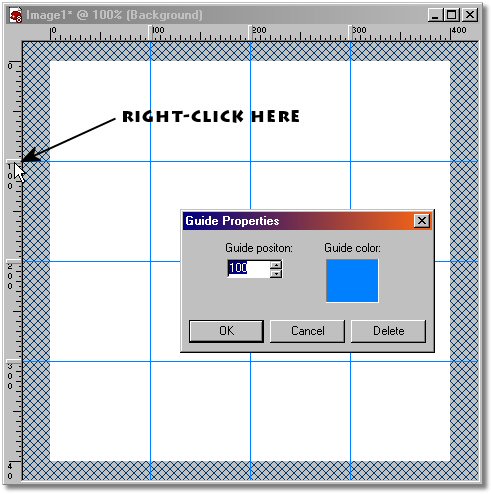 Step 2. Using vector objects draw the seams between our images. - In the View Menu, turn on Rulers, Guides and Snap To Guides as shown below. HINT: - Adjust your image window size as illustrated in the image below. You will need to see about 1/4" of the area outside your image. We will be dropping line end points on the guides outside the image. With your mouse pointer on the left vertical ruler click with LMB and drag to the right and place guide lines at 100, 200 and 300 pixels as shown below. Also, with your mouse pointer on the top ruler click with LMB and drag down and place guide lines at 100, 200 and 300 pixels as shown below.