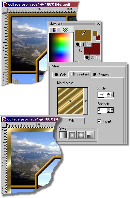 Now we are going to add a Neat frame using a Gradient fill and then the "Inner Bevel" to add a 3D look. Hold on to your hats this is a big one, but a lot of fun! - Load the "Selection #1" alpha channel this time as we did in "Step 11". Select Selection Menu/Load / Save/Load Selection from Alpha Channel. - With LMB click on the Foreground swatch and from the Materials dialog select the "Gradient" tab and make the setting as per below. Now select the "Flood Fill" tool from the Tools toolbar and with the LMB click in the selected area of the border. The border is now filled with our gold colored ribbon as illustrated in the bottom image below. - Now select the Effects Menu/3D Effects/Inner Bevel and use the same setting as we used earlier in this step with one exception make the width 3 instead of 6. Hit the OK button and presto we have a masterpiece.