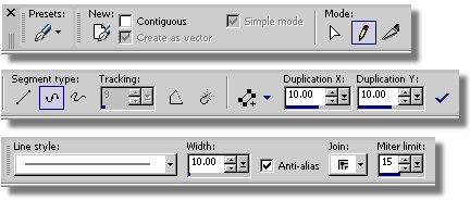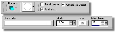 - Set the Tool Option Palette as shown below. The Octagon is selected in the Shape List, Retain style= unchecked, Anti-alias=checked, Create as vector=checked, Line style=Solid and width=10 pixels. - Now we are ready to draw our Octagon in the center of our image. Place pointer at Pt "A" and click with the LMB and drag to Pt "B". With the snap to guide turned on your points will drop at the intersections of our guide lines. This creates our center picture piece area where we will place the picture of honor. Our center piece of you will. - Select the Pen Tool and make the settings in the Tool Options palette as shown below. Mode=Drawing, Segment Type=Point to Point and Width=10 pixels. Pen Tool Icon: