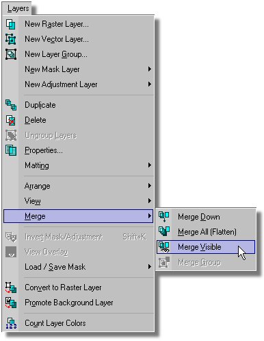 - Select the Layers Menu/Merge/Merge Visible. This will create a raster layer containing all of our image and remove the Background layer. We now have only one layer and it is called "Merged". - If your Layer palette is not visible then please open it by pressing the "F8" key on your keyboard. Once opened slide it out of your way so you can still see your image file.